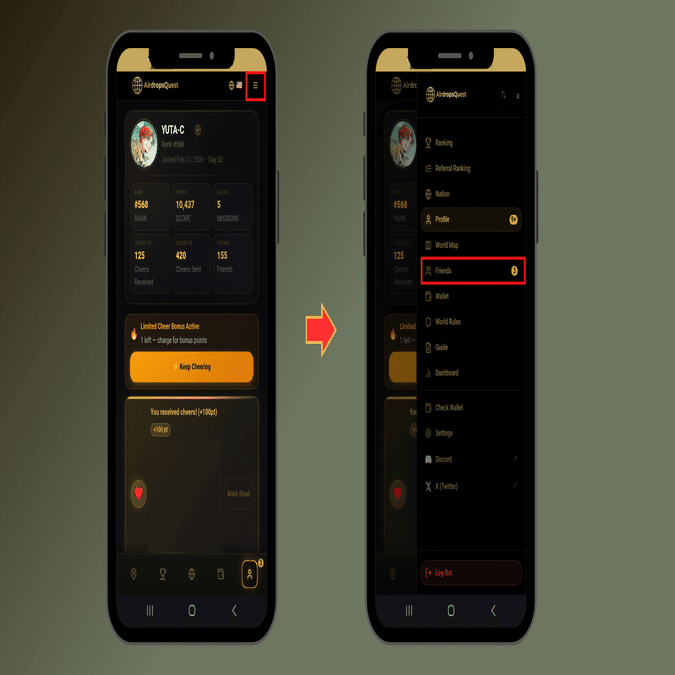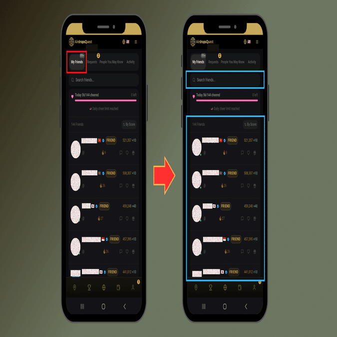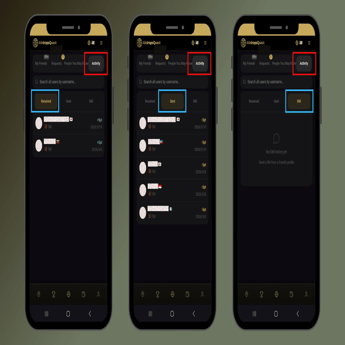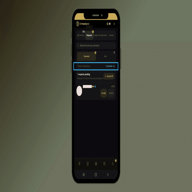 The “Friends” tab in AirDrop Quest is a feature for managing connections between users. Integrating an SNS-style friend system into an airdrop platform is quite rare, and it plays an important role as it directly contributes to point earning.