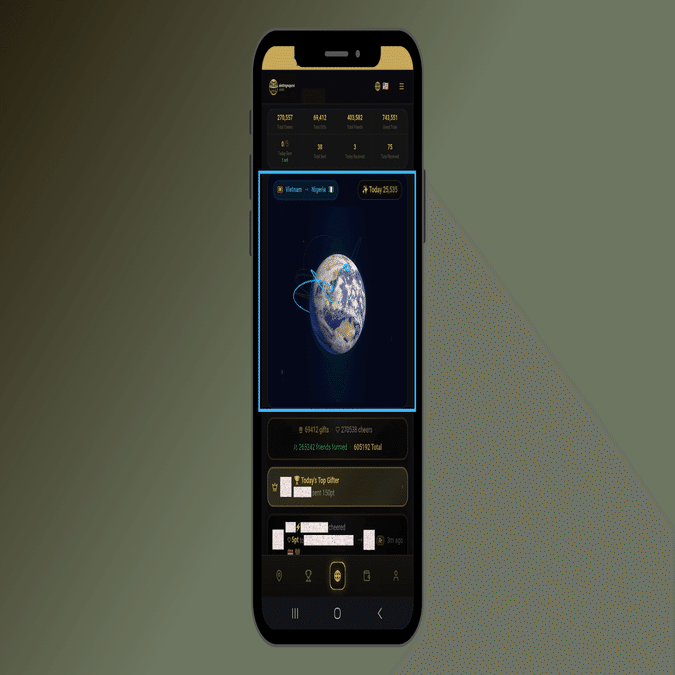 On the globe displayed at the center of the screen, you can see “Cheer,” “Gift,” and “Friend” interactions moving between users across countries in real time.