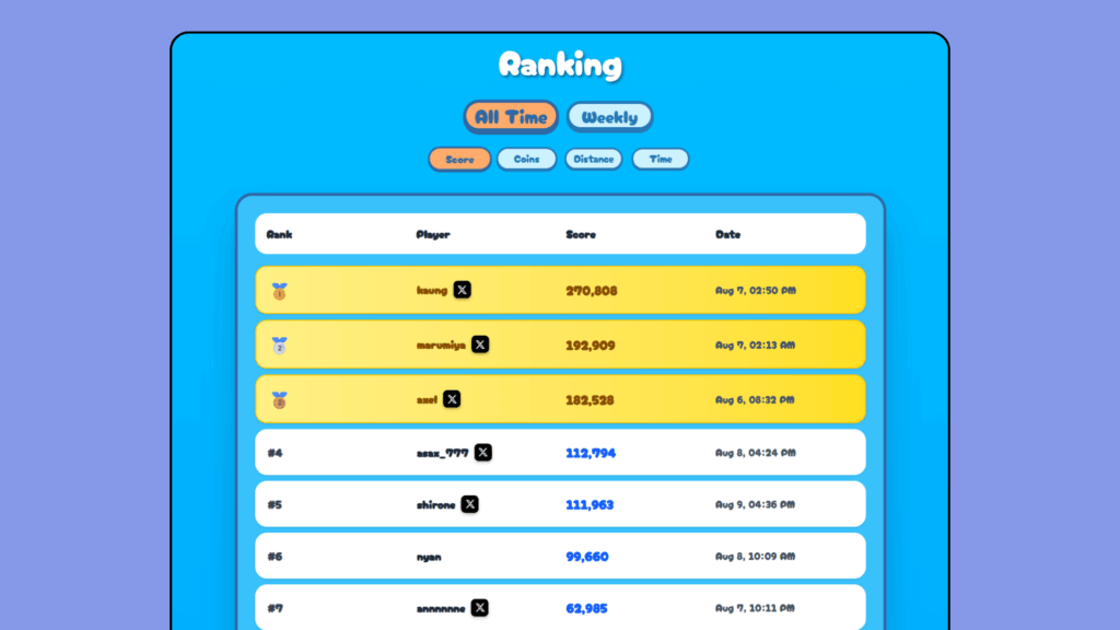 - Base Points = (Number of Coins × 50) + (Travel Distance [m] × 0.2) + (Survival Time [s] × 3)