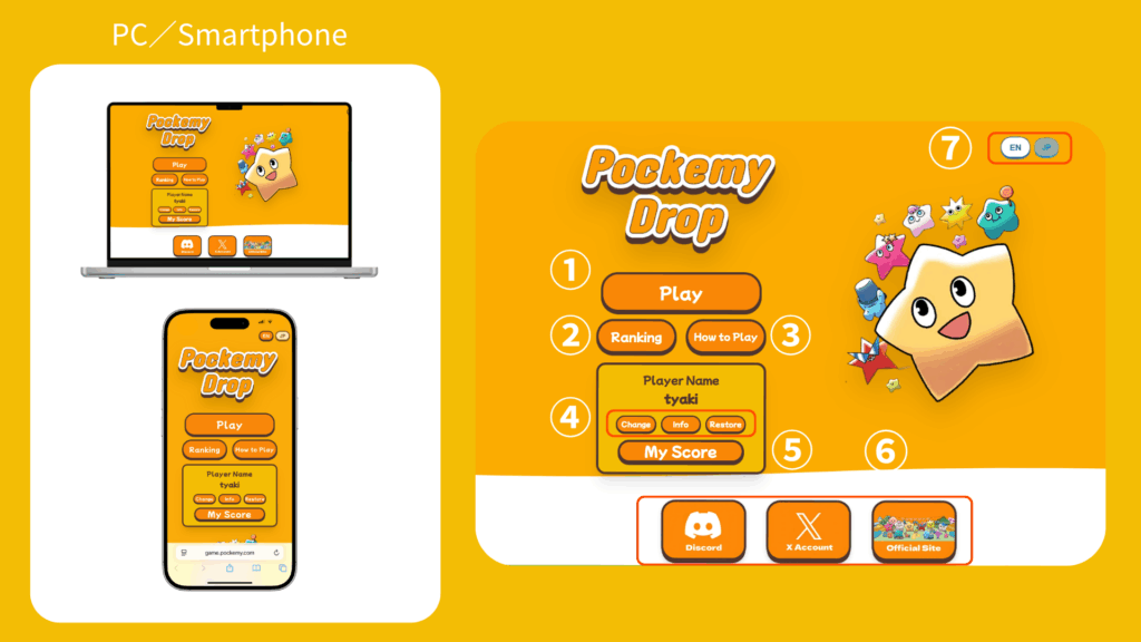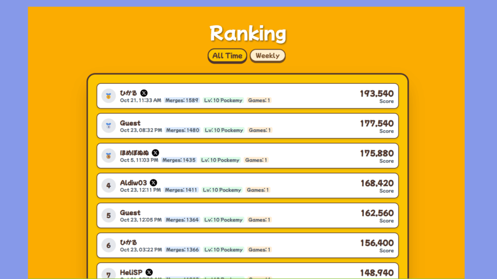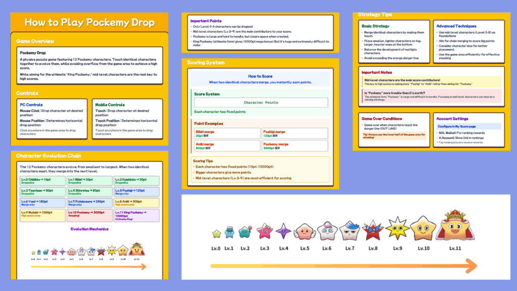 - Final Goal: Merge and evolve identical characters; the top tier is “King Pockemy.” Aim for a high score!!