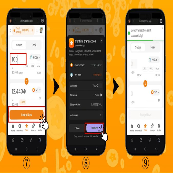 ⑦ Enter the amount in the swap field and tap Swap Now. (A small transaction fee will apply, so it’s recommended to have extra funds ready in advance.)