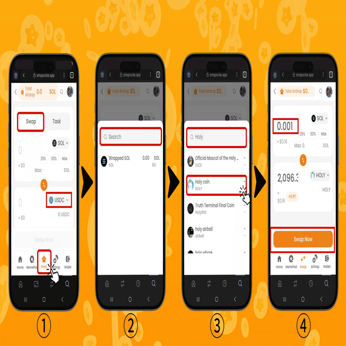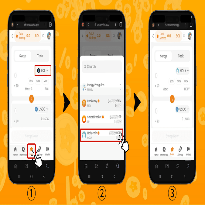 ① Tap Point → Swap, then select the field for “Token to swap to.”