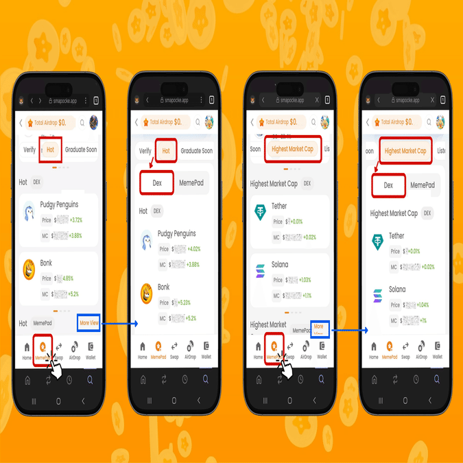 You can also swap popular or well-known tokens by selecting Hot → Dex or Highest Market Cap → Dex from the menu. (Tap More View to see additional tokens.)